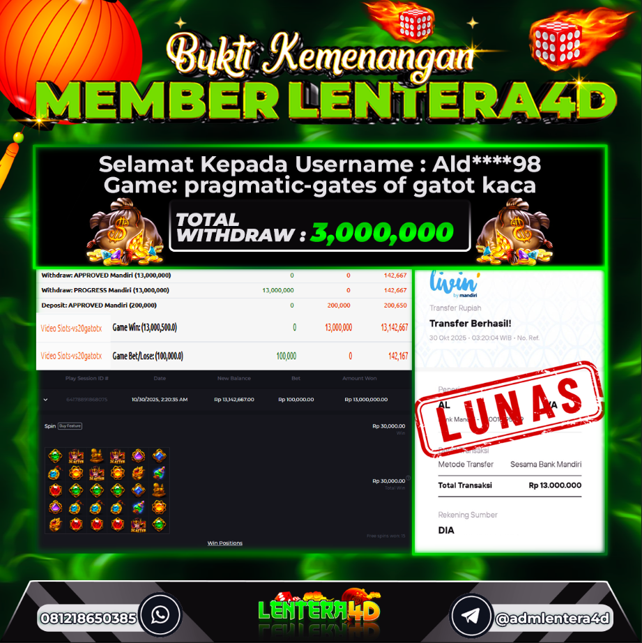 Setiap hari, member Lentera4D berhasil meraih jackpot besar dari berbagai provider slot ternama yang kami sediakan, seperti Pragmatic Play, Habanero, PG Soft, dan masih banyak lagi. Kami secara rutin menampilkan bukti screenshot atau rekapan kemenangan yang berhasil diraih, mulai dari kemenangan ratusan ribu hingga puluhan juta rupiah. Semua slip kemenangan ini kami hadirkan untuk membuktikan bahwa di Lentera4D, peluang menang itu nyata.