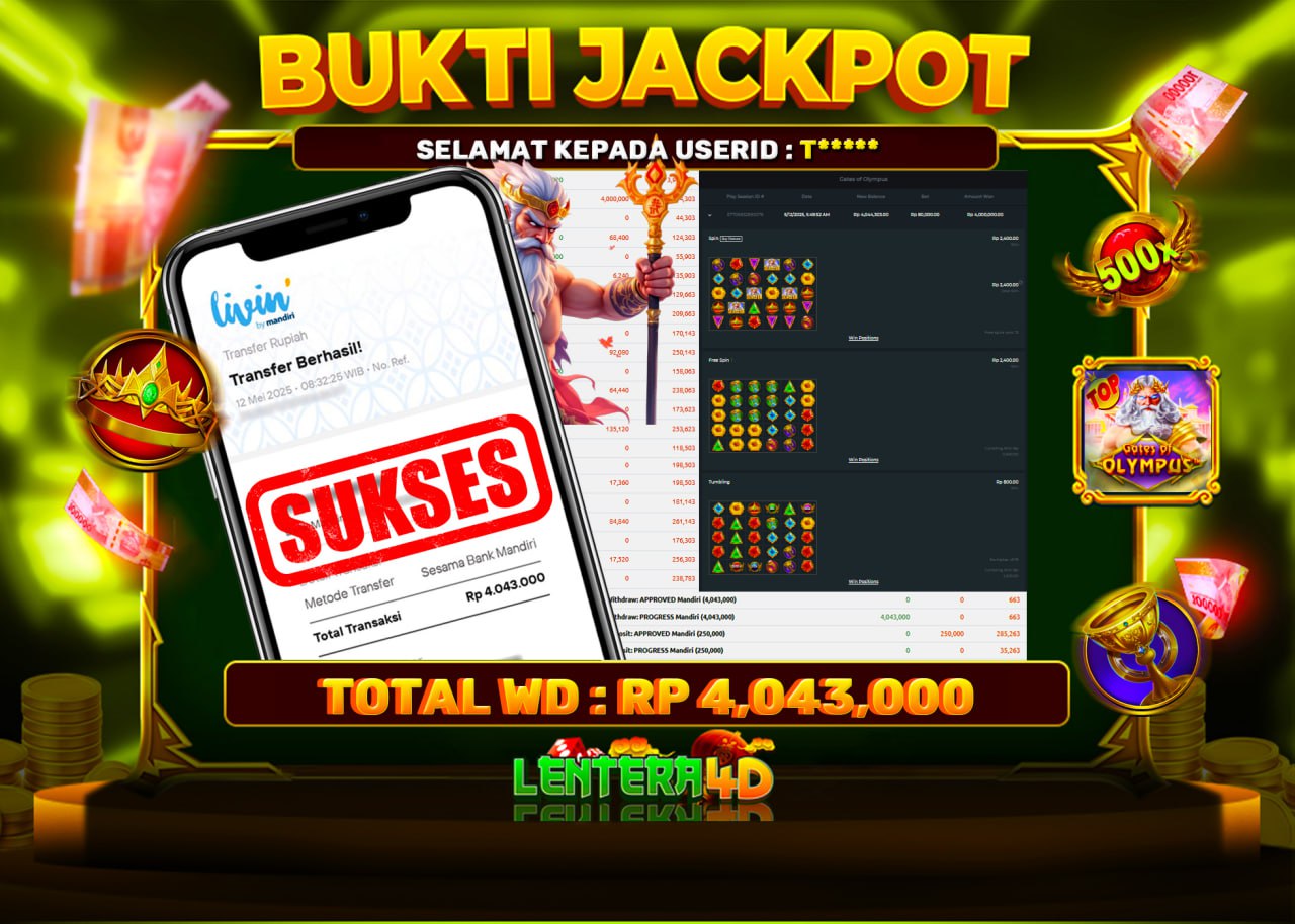 Lentera4D dikenal sebagai situs terpercaya yang selalu menghadirkan pengalaman bermain slot online yang aman, fair, dan berlisensi resmi. Di sini, kami tidak hanya sekadar memberikan janji, tapi bukti nyata berupa slip kemenangan yang dapat Anda lihat secara langsung.
