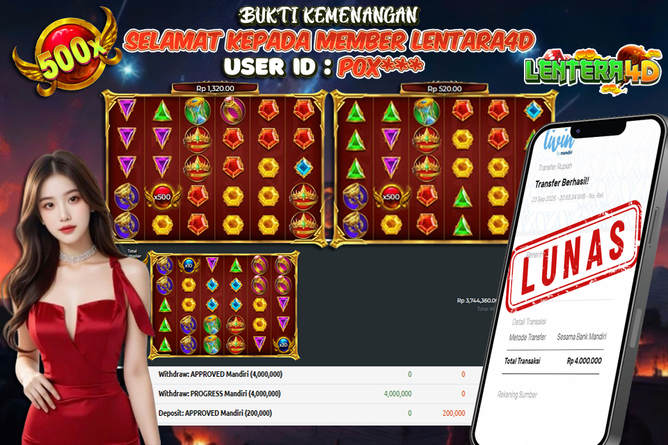 Lentera4D dikenal sebagai situs terpercaya yang selalu menghadirkan pengalaman bermain slot online yang aman, fair, dan berlisensi resmi. Di sini, kami tidak hanya sekadar memberikan janji, tapi bukti nyata berupa slip kemenangan yang dapat Anda lihat secara langsung.